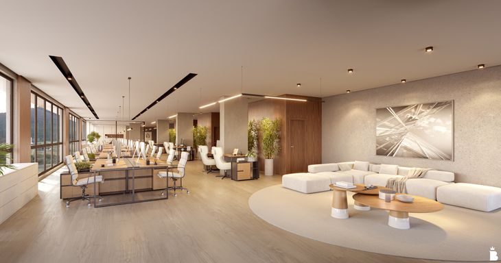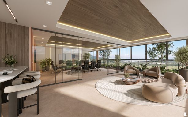 Salas de reuniões, lounge com mezanino, podcast com pé-direito duplo, terraço