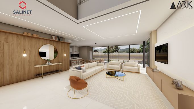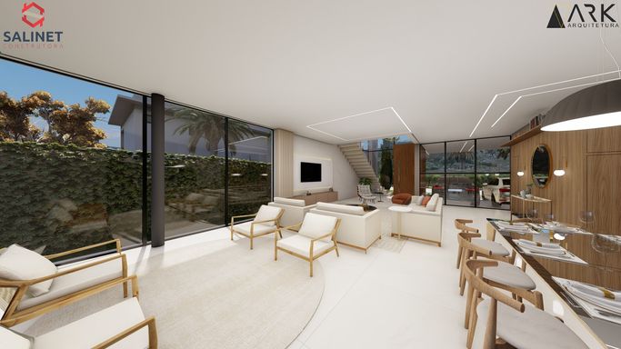 Living integrada amplo com pé direito duplo, garagem coberta para 2 carros, lavabo e banheiro externo na área de lazer.